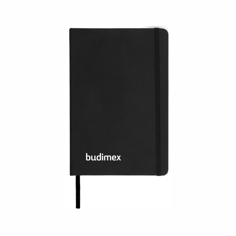 Notatnik A5 (80 kartek w linie), twarda okładka z PU z wbudowanym magnesem umożliwiającym przyczepienie przyborów do pisania (nie dołączone), tasiemka zakładkowa i elastyczna opaska do zamykania
