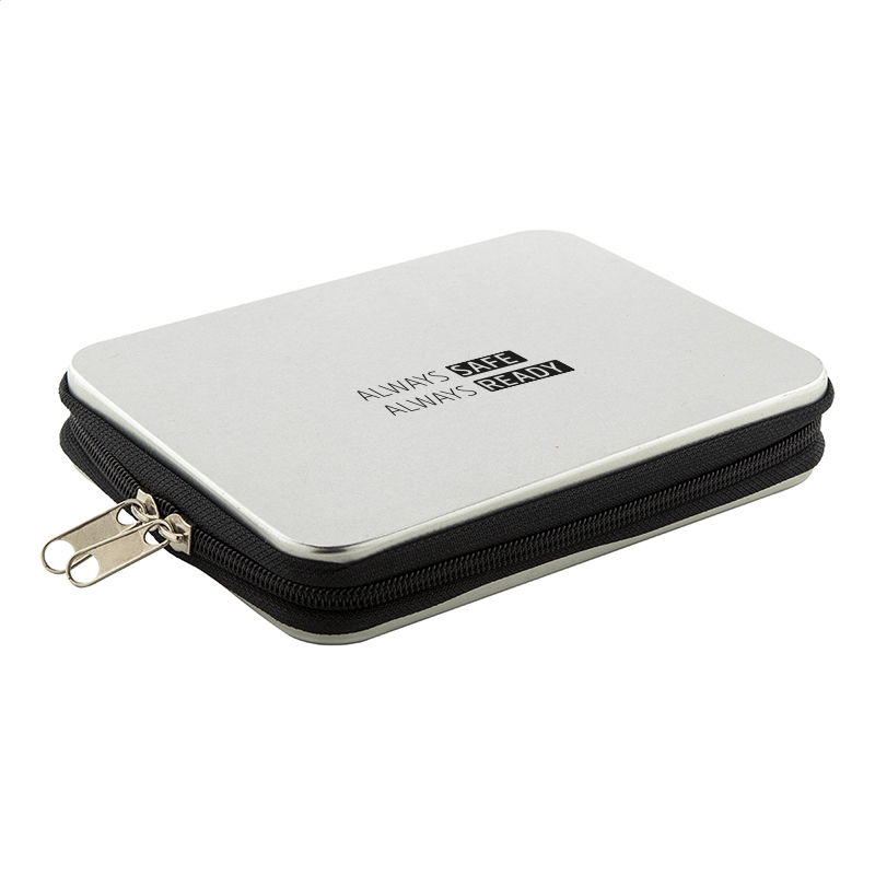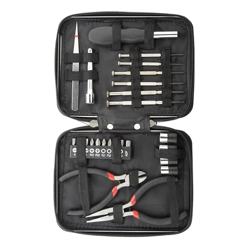25-częściowy metalowy zestaw narzędzi w aluminiowej walizce z suwakiem. Zawiera: szczypce, szczypce tnące, śrubokręt nasadowy, przedłużacz, pęsetę, 6 wkrętaków precyzyjnych, 4-częściowy zestaw nasadek, 10-częściowy zestaw końcówek wkrętakowych.